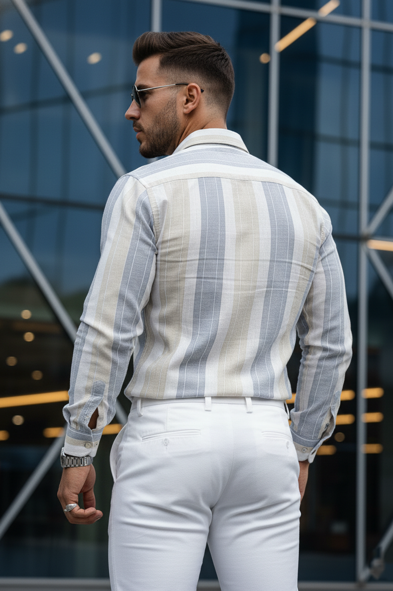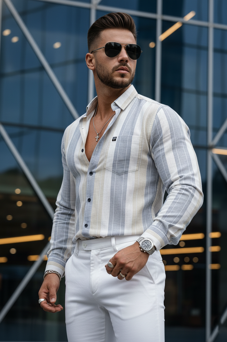 Men Grey Striped Shirt Outfit – Modern Street Style Look 261049715