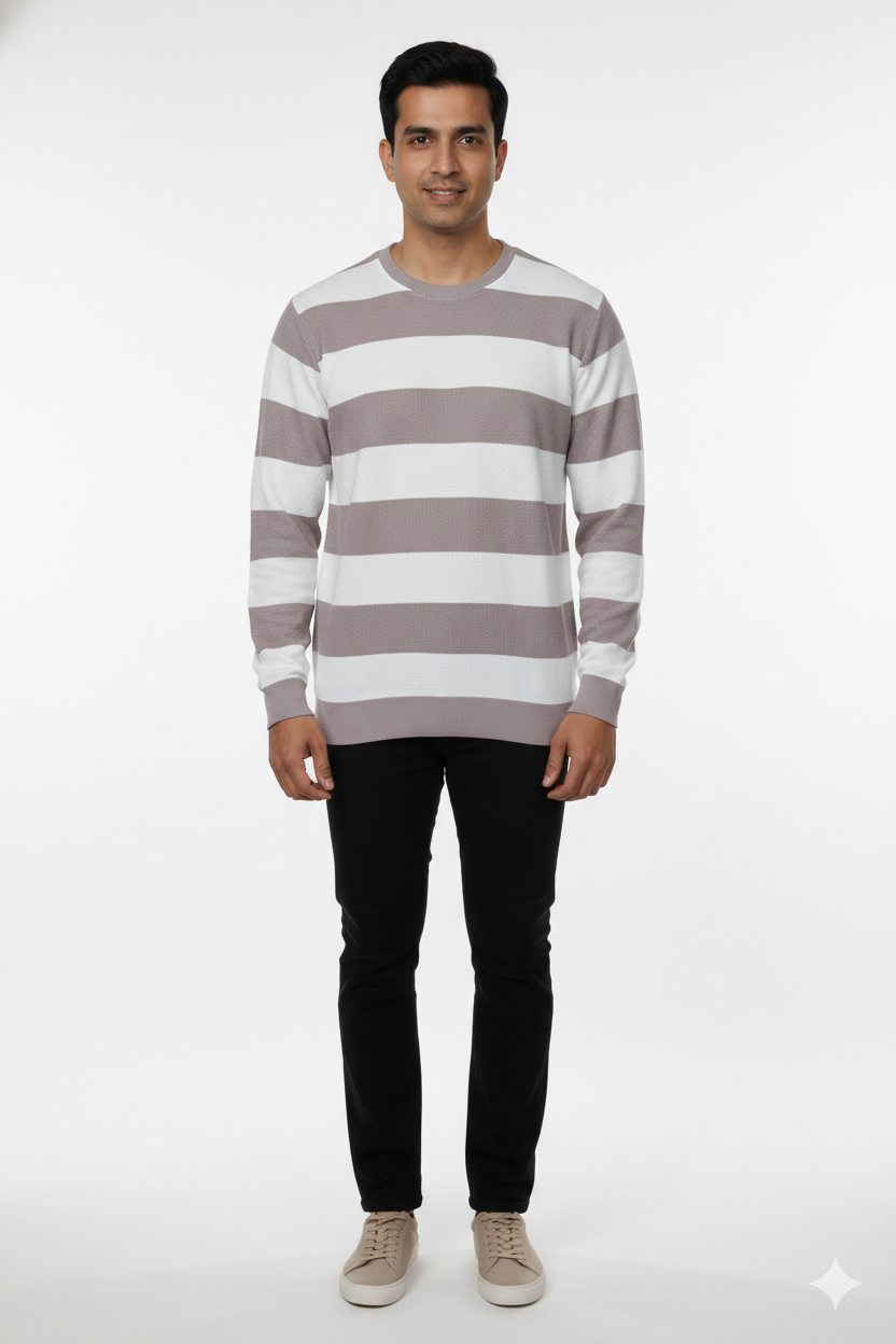 Men Beige-White Striped Crew Neck T-Shirt 251170711