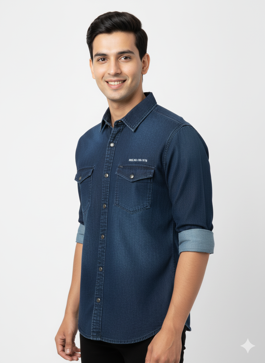 Men's Casual Plain Denim Shirts in Dark Blue
